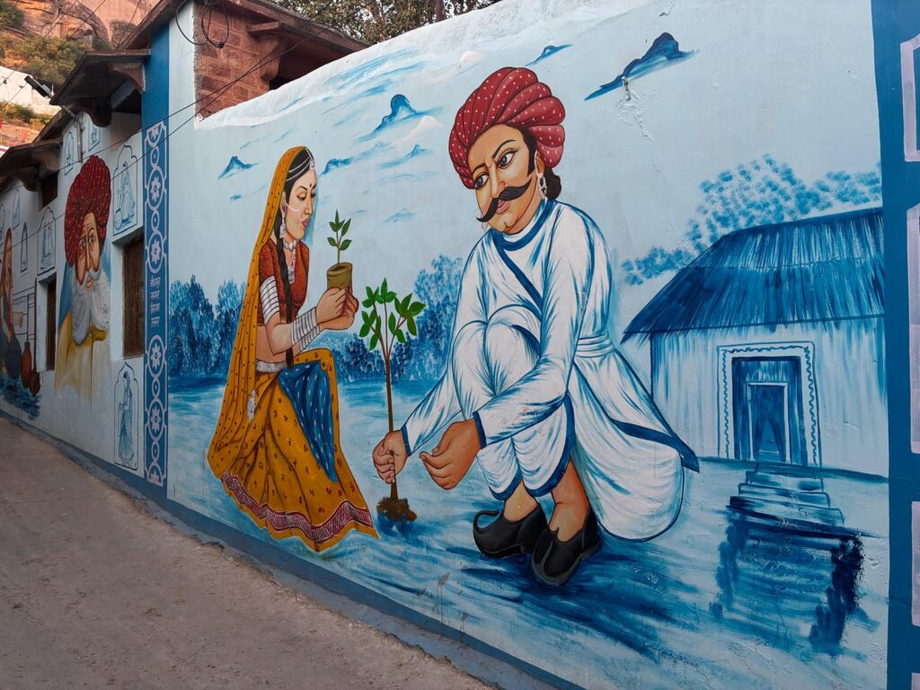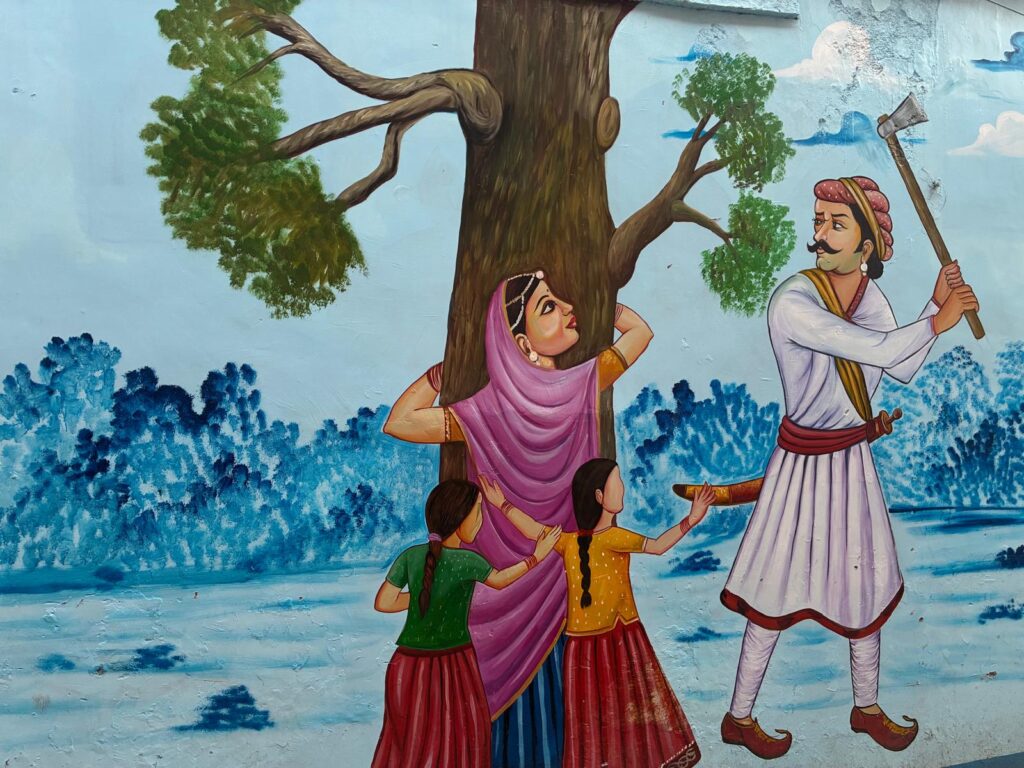 שימו לב למסרים הסמויים בציור הגבר, שגם היום ב 2025 מסמל את הכוח בהודו (ולצערי גם בארץ, וברחבי העולם), באופן אלים בא לכרות את העץ. האקטיביזם להגנה על העץ באה מהדמויות החלשות- האשה, הילדות.